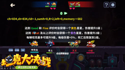 在《坦克大决战》中,老铁们命中敌人时射击的角度越高伤害也就越高评价越好,而评价从高到低总共分为五个等级分别为:Good、Fine、Great、Wonderful、Perfect,当达到不同评价时可以永久提升坦克的伤害,并且每级都会增加5%,最多可以提升9级,但是需要所有老铁们注意的是如果在本回合死亡,那么伤害就会恢复到1级。评价在Good和Fine之间可以收获黄色星星提高一级的伤害,评价在Great及以上可以获得紫色星星提高二级的伤害。所以在游戏中,就需要各位老铁们尽量打出高评价来提高自己的伤害。另外需要注意的是坦克在死亡时,怒气值会减半!减半!减半!重要的事情要说三遍!
