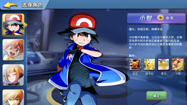 进入游戏选择角色,可以选择智爷、小霞、小茂、菜种四个角色,每个角色都有不同的精灵套牌以及套牌设定,这一分法基本上是知名卡牌手游如万智牌、炉石等分法,有点像职业划分。
