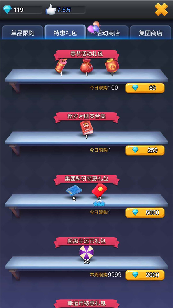 2. 每部贺岁片拍摄完后根据票房档次可获得相应数量的春节积分道具和行为道具,拍摄者所在的集团也会获得相应的春节积分