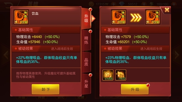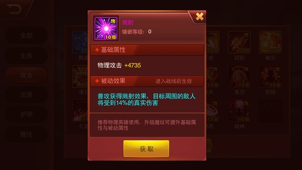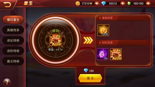 此外,魔纹的培养是可以为所欲为的。《兽人三国》的“魔纹重生”能够让已经培养到高级魔纹“回到原点”,变回初始等级,而且原封不动地返还全部魔纹强化材料。因此,在缺乏橙色或红色魔纹的前期,不妨优先培养合适的紫色魔纹。魔纹重生后完全无损耗,又不耽误英雄的培养,一举两得!