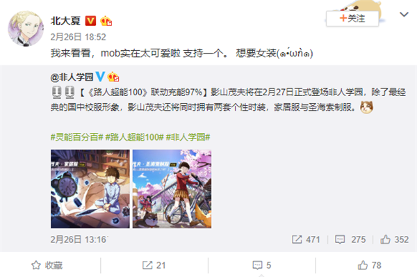当影山茂夫来到学园积聚起100%灵能,一众路人的粉丝和学园小伙伴们也都纷纷热情暴走,好评点赞停不下来。粉丝们表示受到惊吓的心情,只有赶快下载《非人学园》才能得以平复。而体验后对于路人爆发的超还原战斗模式,大家更是疯狂打call,学园激斗让人热血沸腾。还有一大波同学,则给影山茂夫的JK制服时装跪了,激动着高喊要加入龙套的“女装”俱乐部!