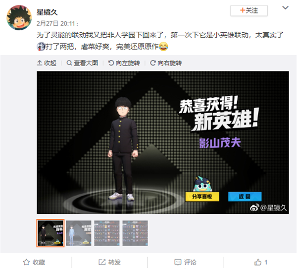 充能100%,《路人超能100》x《非人学园》联动新版本正式爆发,最强灵能力者“影山茂夫”现已登陆学园,更有联动专属活动福利放送!快下载游戏吧(╭ ̄3 ̄)╭