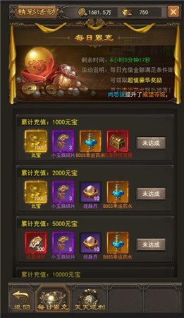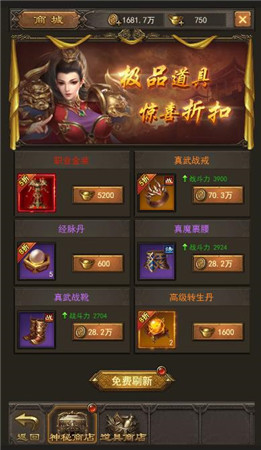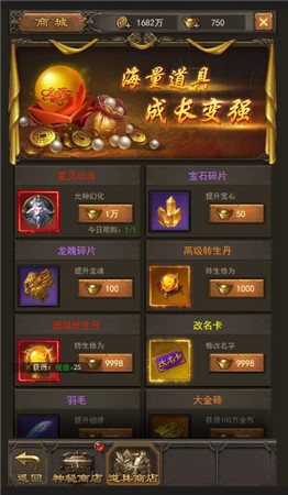 神秘商店可以说是平时使用率最高的消费区之一了,里面最低可以刷新到5折的道具,包括:转生丹,轮回丹,羽毛,宝石,金砖,等材料道具,更有职业金装图鉴,前面有说到,转生,轮回是游戏的主要核心,所以建议,不管是中R小R甚至平民玩家,5折的转生丹必买,最好是攒够2W5元宝买超级转生丹,最为划算。