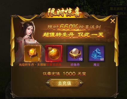 这是一个会随机出现的折扣商店,里面会有一些低折扣的稀有道具,比如红色龙纹,套装石,稀有称号等,虽然看似折扣力度很大,但由于道具的稀有度,即使折扣后价格也是十分不菲,小R基本不用考虑,中R酌情选择,值得一提的是,此处有概率刷出4折的转生,轮回丹,绝对不容错过。