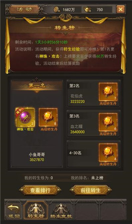 到达新的转生等级后,发育期在补充购买轮回丹同时,继续积攒转生丹,其他材料可根据自身需求购买,比如:羽翼,即将突破获取强大技能,即可购买打折的羽毛,这里的道具,除去有排名活动时给的礼包外,可以算是最便宜的了,绝对要时刻关注进行刷新购买。