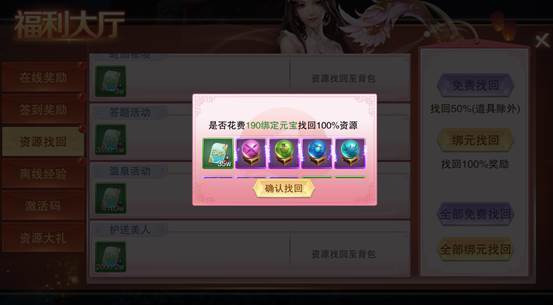 另外,资源找回一共有两种找回方式,一种是普通找回,不过消只能找回资源的50%;另一种完美找回,可以找回100%的资源。 下次知道怎么找回没来得及参加活动而错过的资源奖励了吗?有了这个系统,玩家再也不用烦恼这种事情啦!有元宝的花元宝,没元宝的就普通找回,总之,这是获取奖励的一大途径呢,千万不要错过。
