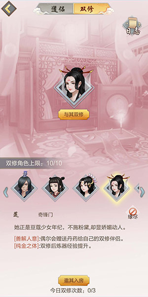 如果诸位有幸寻到了心仪的另一半道侣,还可以邀请其进行双修,双修可以获得一定的奖励,每一位道侣获得的奖励都不相同,需要大家去发现。当然了,玩家之间相互联姻也是可以的哦~不是要等诸位道友有足够实力之后呢。