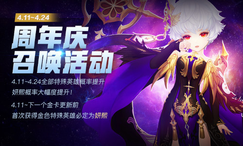 周年活动期间,妍熙的召唤概率也获得了大幅度提升,首次召唤的金卡特殊英雄必定为妍熙!