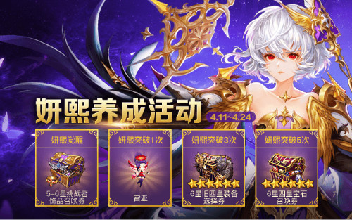 随着妍熙的震撼降临,一周年庆典也随之而来,作为一周年庆典之际降临的英雄,活动期间只需帮助妍熙觉醒并突破一定次数,即可领取5~6星挑战者饰品召唤券等丰厚的奖励。