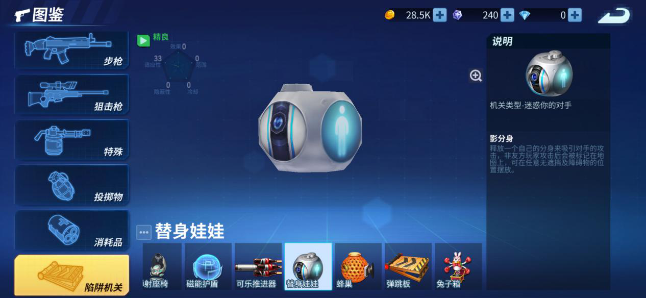 替身娃娃属于吸引型陷阱,放置后可以投影一个和自己一模一样的影子引诱敌人射击。影子被射击后会消失,但是敌人的位置也会暴露。