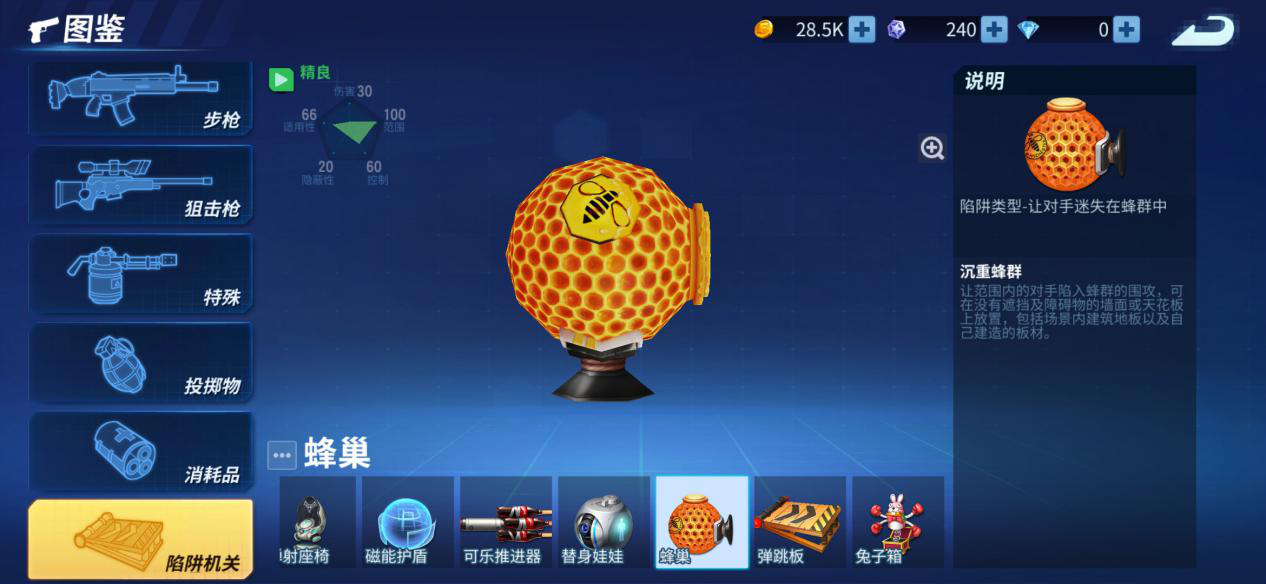 蜂巢属于混乱型陷阱,可以放置在墙上或者建造的墙板上。当敌人靠近之后就会对敌人造成伤害,并且让敌人进入混乱状态,混乱状态是无法操作的。借此机会便可轻易的射杀敌人。