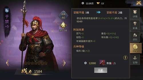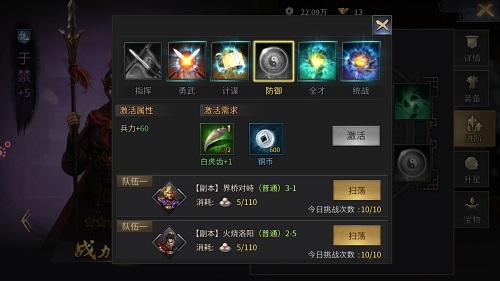 武将进阶。武将拥有指挥、勇武、计谋、防御、全才、统战六种天赋,参与副本战斗可获得激活天赋的材料,激活对应天赋可增加武将的各项基础属性。六个天赋全部激活以后武将即可完成进阶。武将完成进阶可获得被动技能加成,进阶等级越高,被动技能加成越高。
