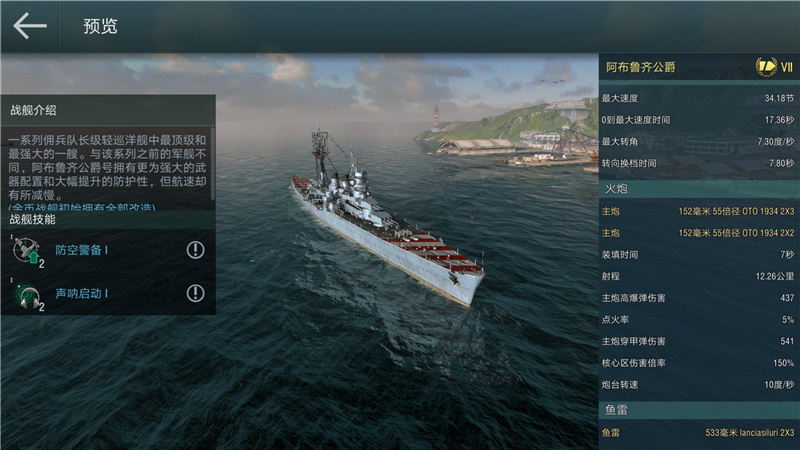 出色的防护性给予了阿布鲁奇公爵更强的操作性,哪怕在面对重炮巨舰时,也可以从容应对。短小精悍的舰身和不错的隐蔽性给了阿布鲁奇公爵不错的撤退能力,鱼雷、防空等也可圈可点。