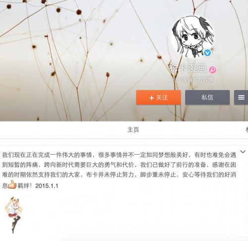 布卡漫画微博原文:我们现在正在完成一件伟大的事情,很多事情并不一定如同梦想般美好,有时也难免会遇到短暂的阵痛,跨向新时代需要巨大的勇气和代价,我们已做好了前行的准备,感谢在困难的时期依然支持我们的大家,布卡并未停止努力,脚步重未停止,安心等待我们的好消息。羁绊!2015.1.1。