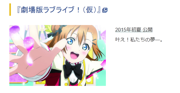 近日在日本电影公司“松竹映画”的120周年纪念主页上,更新了将在2015年进行上映的电影列表,在更新的电影名单中除了有真人版《机动警察》以外,还包括了人气动画《LOVE LIVE》的剧场版预告。根据官方网站上最新的显示,剧场版《LOVE LIVE》将在2015年的初夏在日本进行上映,标语是“实现吧!我们的梦想”。但是剧场版的标题还未确定下来,现在还是以《剧场版 LOVE LIVE(暂定)》的标题出现在网站上。