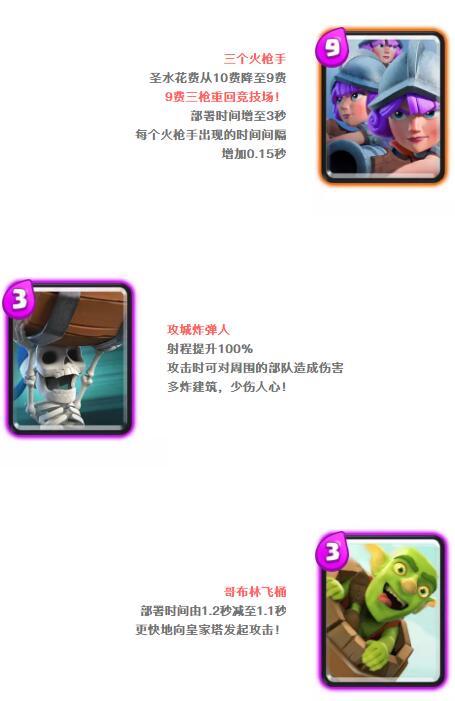 本轮平衡性调整主要是针对三个火枪手、炸弹兵和黑暗王子,还有更多卡牌的调整,敬请期待!
