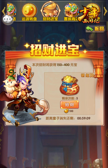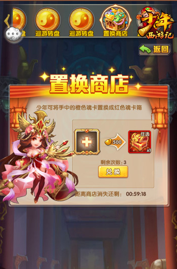 此外,“巡游天地”玩法拓展上线,新增了“招财进宝”、“置换商店”、“直购商店”三大事件,玩家参与三大事件互动可将多余的橙色魂卡置换成红色魂卡箱,从而加快魂卡的收集进度,并可获得大量元宝、金色符石箱等珍稀资源奖励。