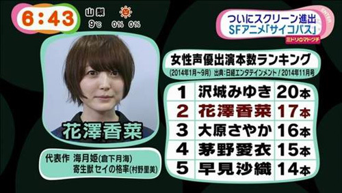 去年1月~9月花泽香菜的出演动画数在女性声优中是第2名