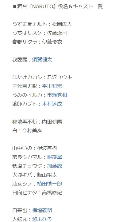 其中佐助将由佐藤流司进行扮演,小樱的扮演者则是伊藤优衣,而須賀健太将扮演我爱罗一角,从公开的照片中可以看出,相比原作还原度非常的高,在公演之前官方还会陆续公开其他角色的定妆照。主角鸣人由 松冈广大出演;佐助由 佐藤流司出演;小樱扮演者则为 伊藤优衣。