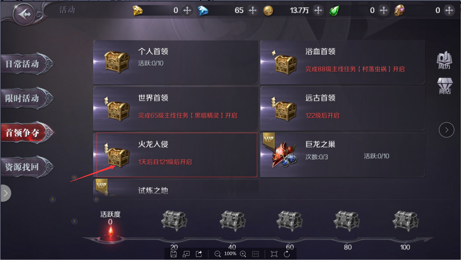 【火龙入侵】会在服务器开启第2天且玩家达到121级后开放,每日13:00-13:15开启活动,想要获取极品装备和材料的勇士们一定不要错过。 【火龙入侵】需要达到指定等级才能参与,火龙王等级会随..