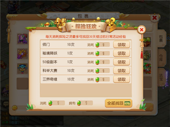 进入暑假,很多朋友也许已经给自己安排了诸多假日活动计划。如何在休闲娱乐的同时,保证自己不错过游戏中的各种精彩呢?在活动期间,玩家每日活跃度达到60、100时,将能额外获得特殊道具探险之灵。它能帮助玩家找回错过的日常任务经验,让玩家可以安享假期。而持有多余探险之灵的玩家,也可以将其赠送给自己好友哦!