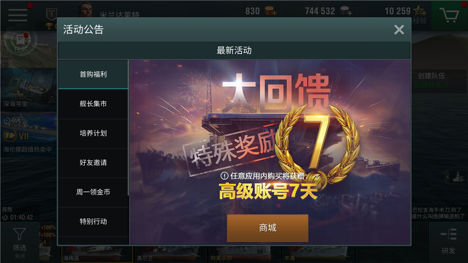 《战舰世界闪击战》还在本周为玩家们准备了丰富的活动和诱人的奖励——在商城内进行任意购买,即可获赠7天高级帐号,畅享经验和银币加成;使用海伦娜赢得两场胜利(不包括联合作战),就能赢得海量银币、舰长徽章、每日补给箱和1天高级帐号。