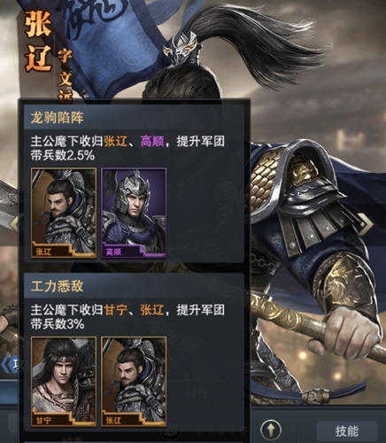 首先从张辽的基础属性可以看出,他是一名统帅型橙将,统帅值达到了96,武力值也达到了91的水平。缘分方面,张辽与高顺和甘宁均可组成缘分,缘分共计提高5.5%的军团带兵数,这个加成效果十分强力。并且,除了有着不俗的基础面板数值,张辽的技能也更为强大。