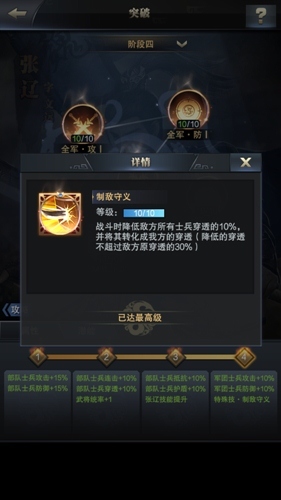 而张辽突破后,能力得到全面提升。所有的突破加成变为全兵种加成,张辽直接变为一个全兵种武将,PVP第一神将的地位继续得到稳固。突破到三阶段,双技能提升10%的效果,“虎威”克制系数相关加成提升到30%。突破到第四阶段,张辽将解锁技能“制敌守义”,可以降低敌方集结军团的穿透10%,并增加到我方集结军团上。这是游戏内首个吸取敌方穿透属性的技能,加成效果十分明显!