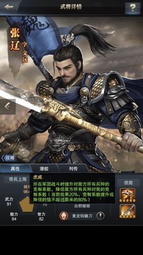 张辽的基础技能“虎威”,不但能提升所在军团对敌方所有兵种的克制系数20%,也能降低敌方对我方军团所有兵种的克制系数20%,这个在游戏内独一无二的强势技能,造就了张辽PVP第一神将的地位。第二个基础技能“突袭”则是一个步兵技能,能提高军团步兵20%攻击力,加成效果比关羽还高,使得张辽在突破前可作为一个步兵神将来使用。