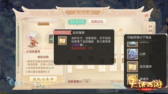龙族登场,萌宠小五叶也将重回大话,为玩家们助阵!回归玩家活跃度达到不同阶段,可解锁丰富的奖励!包括能抽出小五叶的龙回福券、更有任侠限时时装、特殊变身卡、山妖和丰富的游戏道具等你拿!非回归玩家与回归玩家建立绑定关系,同样有机会把小五叶抱回家!快邀请你曾经并肩作战的好兄弟们回归大话江湖,体验龙族惊天威力吧!