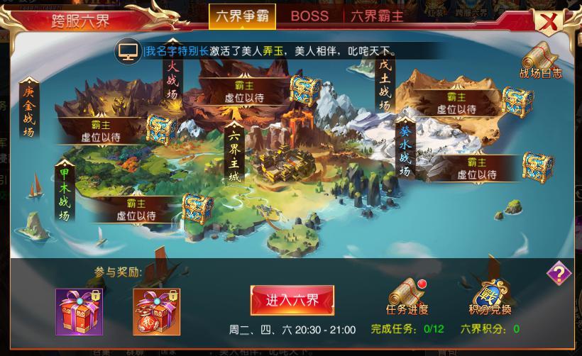 跨服六界每日都可进入,完成任务可获得战场积分,用于在跨服商店兑换物品。每日14:00,16:00,22:00,24:00刷新boss,击杀获取丰厚奖励。