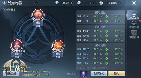 在本次更新后新增的战宠魂器系统中,可以让玩家携带战宠装备,进一步强化战宠的属性。战宠装备分为魔壶、魔书、魔炬三种,需要角色达到特定等级才能相继开启装备栏。魂器还能通过强化、升星等方式增加属性,让战宠的能力更强。集齐三大魂器,让战宠们成为更可靠的旅行伙伴!