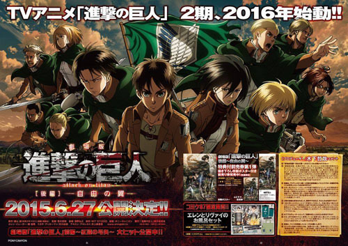 「进击的巨人」剧场版前篇"红莲之弓矢"已经在2014年11月22日上映;而「进击的巨人」剧场版后篇"自由之翼"也公开准确的上映时间,将会在今年6月27日公开上映。此外,在最新公开的预览图可见有「进击的巨人」TV动画的第二季消息,TV动画的第二季将在2016年播放。具体内容还需等待,敬请期待。