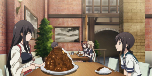 下面还是说回舰娘中的同人neta。在第2话中重巡足柄担任轻巡级舰娘们的老师,在课堂上不写作业的夕立被足柄叫起来回答问题,但是足柄完全是威胁式的口吻,旁边的睦月说足炳老师似乎很生气,她前面的如月便说:“听说足柄老师联谊又失败了”于是如月就被足柄用粉笔轰沉了,在足柄的同人创作二次设定中确实有大龄剩女的属性,因此动画制作组依照这个设定设计了搞笑的场景。像是赤城大胃王的这种二次设定在第二话中都有出现,虽然很多人对这些情节都是会心一笑,但还是有部分观众明显不买账。