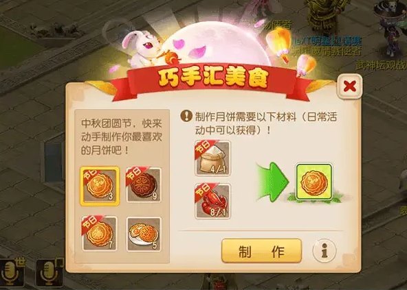 中秋到来,月兔也在三界撒下了不少月饼制作材料,等待玩家收集。玩家只要完成各种日常任务,即可获取这些材料,制作月饼。而每一种不同的月饼,都会为玩家带来相应的惊喜。