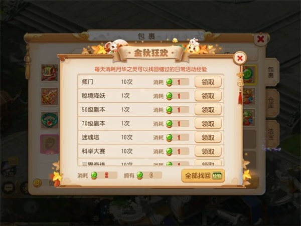 中秋是一个属于团圆的节日,在这一天,有无数游子回到家中,与亲友团聚。为了能让这些游子享受一段美好假日,《梦幻西游》手游也在9月12日~9月19日,推出金秋狂欢活动。玩家只要每日活跃度达到60/100,即可获得月华之灵。这一道具能帮助玩家找回错过的日常任务经验。如果玩家有多余的月华之灵,也可以将其赠送给朋友哦!