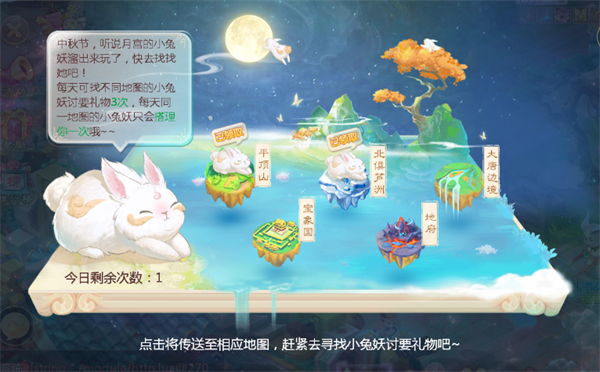 等级≥35级及以上单人可参与“玉兔倩踪”玩法,玩家通过活动页面可以传送至相应地图,寻找到小兔妖之后即可向它讨要礼物!礼物包含经验、1级宝石、伙伴修炼册、高级技能书残卷、属性卡、月华积分等,每个玩家每天可找不同地图的小兔妖讨要礼物三次,但同地图兔妖只会搭理同一玩家一次,敬请注意。