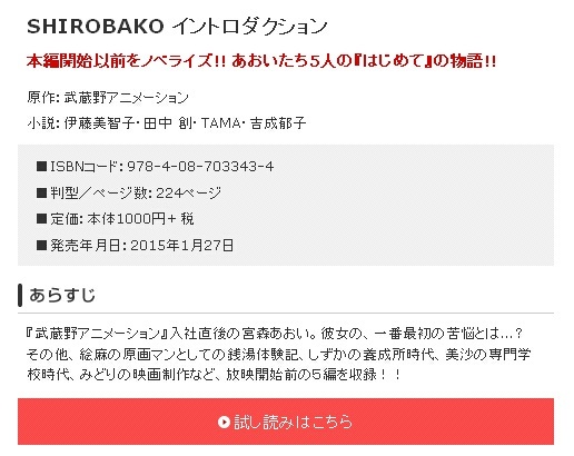 《SHIROBAKO Introduction》是一部小说集收录了四位作者创作的五位妹子的故事,小说中的故事时间是在动画故事时间前,因此是一部前传性质的小说。五个妹子的故事包括喵森刚进入武藏野时面临的第一件麻烦事,绘麻和同事公共澡堂集体泡澡初体验,坂木静香还在声优养成所时代的故事。目前公开的章节是绘麻的部分,其中有萝装作监大人带着全套的洗澡装备邀请绘麻一起去泡澡,试读章节就终止在这里,后面绘麻进入公共澡堂的场景只能靠脑补了(参加首图)。小说售价1080日元总页数224页,如果有日文基础并且喜欢白箱的话不妨收一本。