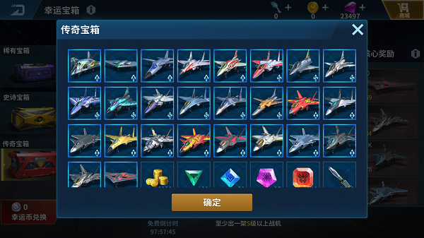 传奇宝箱中能开出的最好的奖励是X级飞机,X级飞机是目前游戏中最顶级的飞机,这无疑是非常吸引人的。同时传奇宝箱依然有免费打开的机会,虽然免费单抽的冷却时间要2天,但终究是给广大欧皇们留了一道门,见证单抽的奇迹。还有一点,奖励飞机中移除了B级飞机,也就是说一旦抽出飞机那么最少也是一架A级飞机哦。