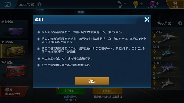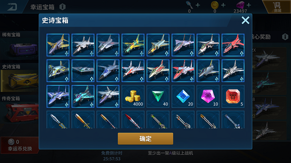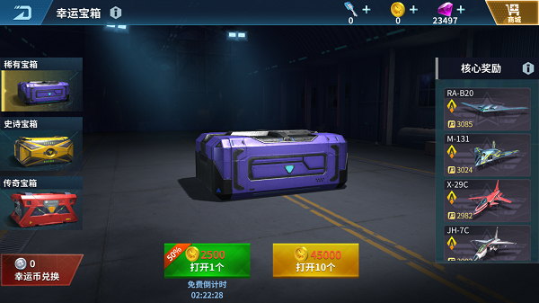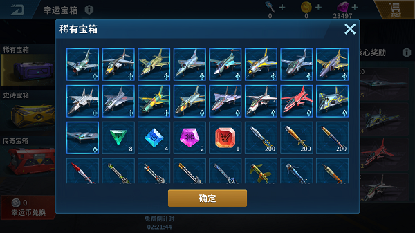 越高级的幸运宝箱,有几率获得的飞机品质就越高,单抽有几率获得以上奖励之一,十连抽则有几率获得以上奖励10个。使用金币就能打开稀有宝箱,还有几率抽到一些只能钻石获得的道具,总的来说还是挺划算的。