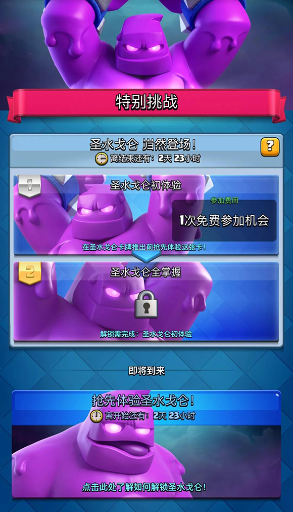 一颗陨石坠入竞技场 所到之处圣水翻涌 于无形幻化做巨兽 这个庞然大物究竟是什么! 皇室战争全新卡牌 圣水戈仑岿然登场 圣水戈仑特别挑战活动正在进行中 参与即可在新卡牌推出之前抢..