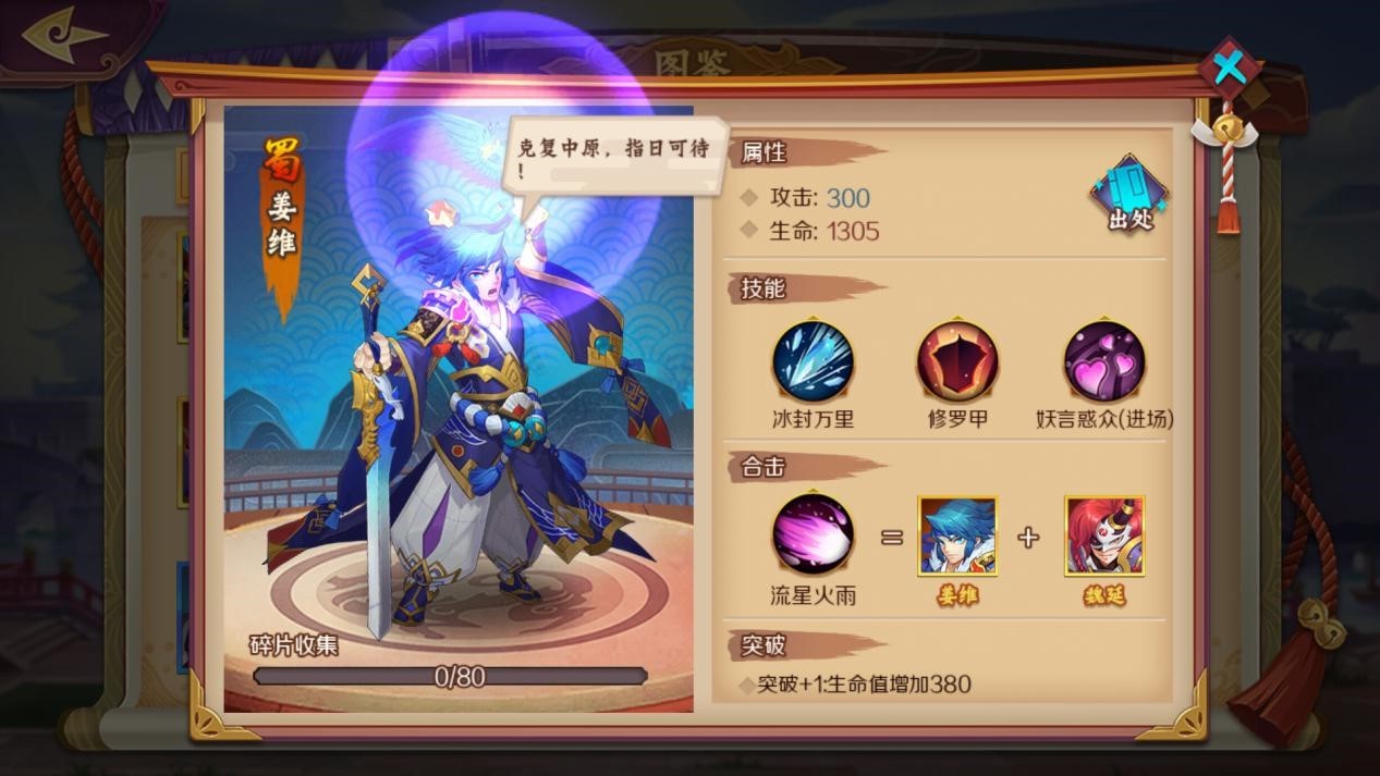 姜维非常被诸葛亮看重,他本人又异常聪慧,能力出众。一心想要匡扶汉室,奈何有心无力,在蜀国人才凋零,后继无力的情况下抱憾而终。姜维拥有强大场控能力,冰封万里能够冻僵敌军,让他们不能进攻。而妖言惑众则正应了他的巧言善辩,可谓是继承了诸葛亮的辩论能力,能够让敌将不能攻击。修罗甲能够抵御更多的伤害,为蜀国抗下强大压力。