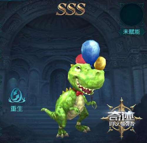 小恐龙外形可爱,身手敏捷,战斗表现让人刮目相看。主动技“水球攻击”可喷出水球攻击敌人,造成水元素伤害,并受自身敏捷加成。再可爱的外形也挡不住霸王龙的内核,短小的上肢,最大限度的保持平衡,日行千里不在话下。水球伤害只是它的特技之一,强化护盾、伤害减免、防御提升等防御技能更可在主人身前建起“防护网”,不管是在协战位还是助威位,都可发光发热,毕竟恐龙在哪个年代都是皮糙糙、肉厚厚的存在。