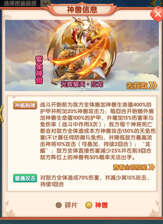 光辉耀天·应龙不仅拥有强大的技能属性,它还拥有紫金神兽的两大特色养成系统——神兽化身和神兽法术。在化身系统中,玩家可根据阵容需要,为紫金神兽定制三只金色神兽化身,从而开启化身技能,这将极大提升紫金神兽的战斗能力。此外,玩家还可为紫金神兽装备法术书,激活上阵神将的法术奥秘,为神兽提供额外的属性加成。