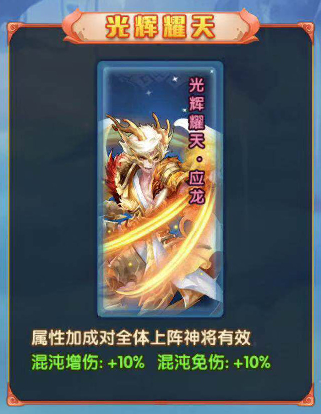 除了拥有强大战斗实力,光辉耀天·应龙还将开启全新图鉴【光辉耀天】,少年们激活图鉴后,将会百分比提升全体神将的混沌增伤与混沌免伤,大幅提升阵容强度。