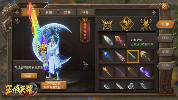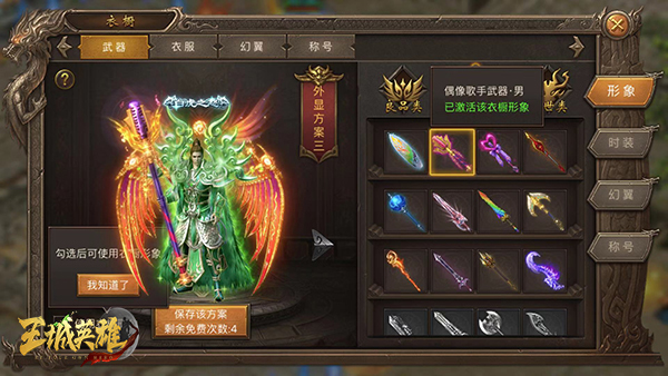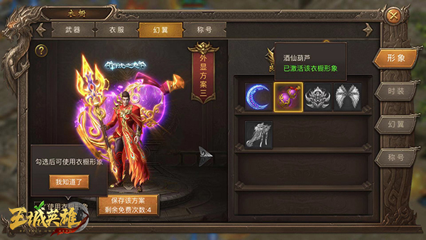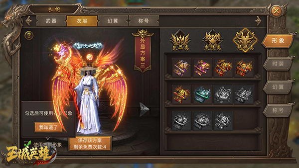 在主界面点击“衣橱”按钮进入时装系统,该界面包括武器、衣服、幻翼等各部位的皮肤展现。玩家可以通过各模块查看、替换相应位置的皮肤。如:形象功能,玩家可以预览到当前的外观皮肤,激活后图标变色,未拥有则时装呈灰色锁定状态。而在时装的右下方,还会出现相应的皮肤简介、获取方式等信息。收集时装不仅可以获得丰厚的属性加成,还能激活相应的称号。