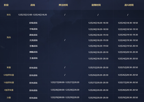 作为备受玩家期待的全服顶级赛事,“决战逍遥津”本赛季依旧采用分级竞技制度。玩家在12月23日报名参赛后,将在APP、混服及应用宝三大战区内进行对抗,每个赛区按照玩家等级分为初级、中级、高级、无双、至尊、巅峰、王者7大战场。在12月24日的海选赛结束之后,玩家将根据赛程安排,依次经过复赛、64强赛、16强赛、4强赛等多段赛程,并于12月29日的决赛上争夺最强霸主之位。
