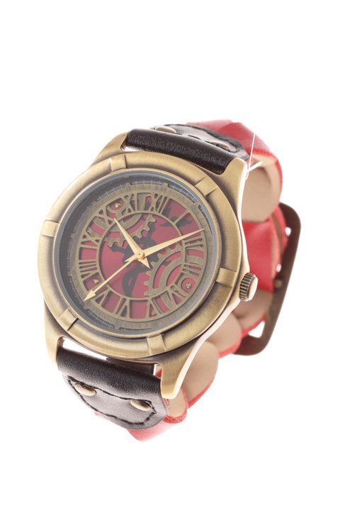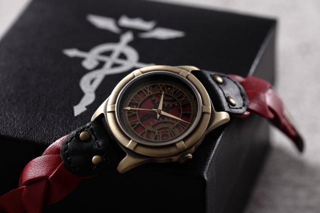 《钢之炼金术师》本次与SuperGroupies 合作推出的手表于1月15日 ~ 2月8日数量限定预约。爱德华款手表盘面为3层设计、最下层是蛇十字架。红色表带则以爱德华头发为原型 。表盘以机械铠原创设计。重厚感金属色男女都适合。附特制BOX。价格为12960日元 (约700元),预计于2015年5月发货。