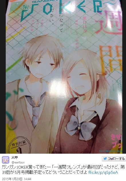 之前就已经宣布过了要在《月刊GANGAN JOKER》2015年2月号上完结的漫画《一周的朋友》在最终话上出现了“下集预告”,称将要在同杂志的2015年5月号(2015年4月22日发售)上揭载第39话,标题的名称为“一周的朋友”。不过根据预告的内容来看,第39话极有可能是本作的后日谈。