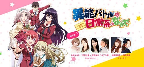 去年10月动画化的《日常生活中的异能战斗》,一口气请到6位声优的庞大阵容,包括山崎はるか、早见沙织、种田梨沙、山下七海、福原香织、加藤英美里,男主角的声优冈本信彦缺席,因此男主角的位置又空出来了……